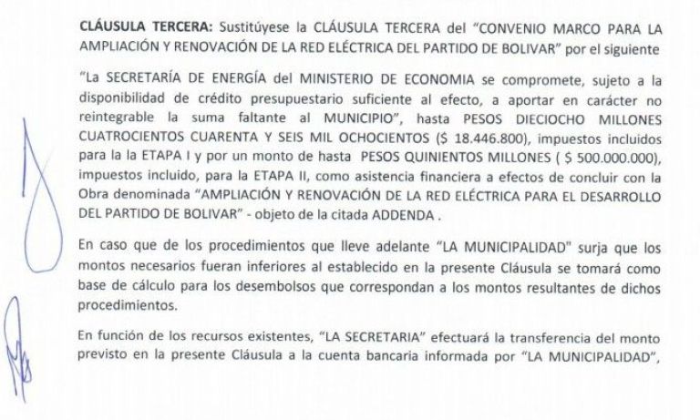 Tanto en el año 2014 como en el 2015, el convenio obtuvo dos nuevas addendas para actualizar los fondos y la suma pasó de $150.000.000 a $340.000.000. De ese total, la Municipalidad recibió a la fecha un total de $286.916.675,20, del cual $154.379.000 se destinó a la Etapa II de la obra denominada “Construcción de la Estación Transformadora de Bolívar”.