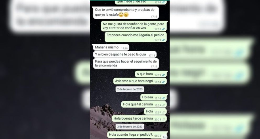 Así fue como a través de WhatsApp Sena hizo el pedido que en total significó un monto de $16600. Una vez que realizó la transferencia bancaria, ingresó a su cuenta de Facebook. “Encontré una captura de pantalla que se buscaba a la señora por estafa. Le mandé un mensaje y me dijo que quien había subido eso a las redes me de pruebas. Me dijo que me quede tranquila, que al otro día el pedido salía para Bolívar”, describió.