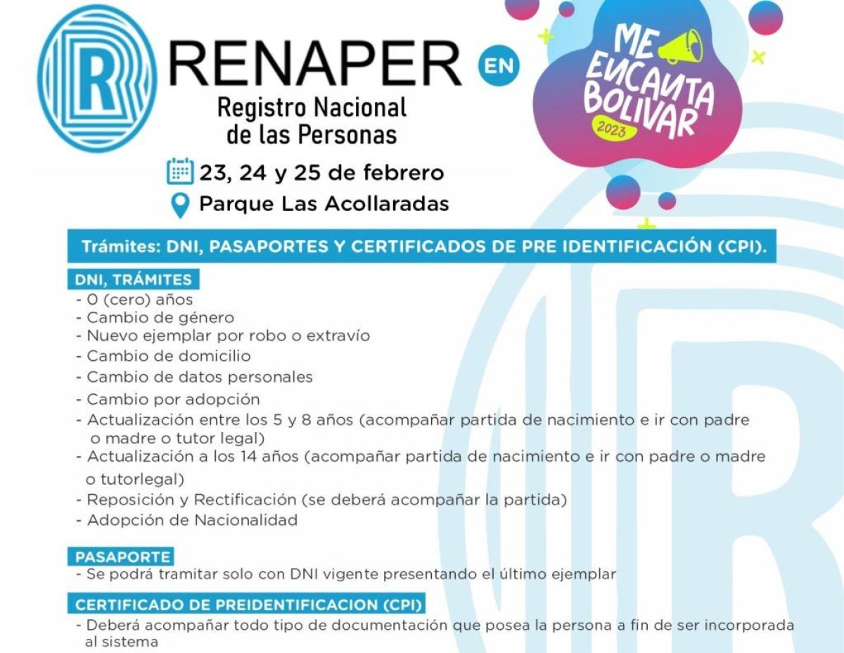 El Registro Nacional de las Personas (Renaper) brindará atención a la comunidad en el predio donde se realiza el Me Encanta Bolívar 2023. Conocé qué trámites se podrán realizar en la unidad móvil.