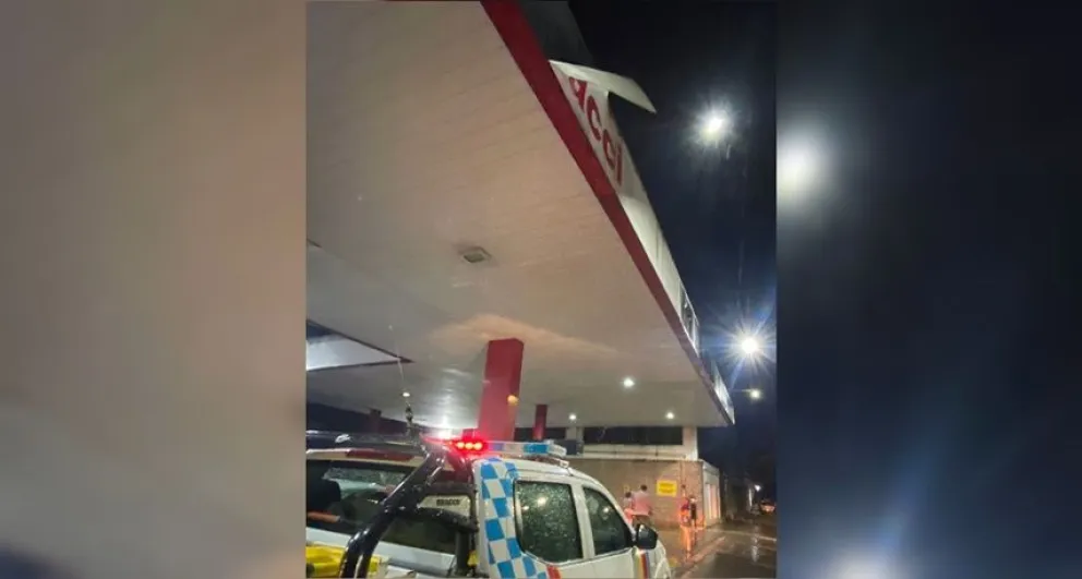 En tanto, la lluvia y el viento ocasionaron que una parte de un cartel de la estación de servicio GNC, ubicada en avenida 3 de Febrero y Viamonte, se desprendiera y cayera sobre un vehículo. Personal de Defensa Civil y de Seguridad Vial se hicieron presentes en el lugar y asistieron a la propietaria del rodado, un VW Gol Trend, que ingresó a la estación de servicio para resguardarse de la tormenta y las ráfagas de viento. Producto del siniestro solo se originaron daños materiales.