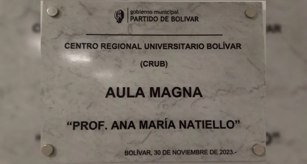 Días atrás se realizó un acto homenaje a Ana María Natiello, docente, militante y concejal local en el Centro Regional Universitario de Bolívar (Crub). El aula magna de la institución lleva su nombre en reconocimiento a su trayectoria. “Realmente fue una sorpresa y no lo imaginaba”, afirmó.
