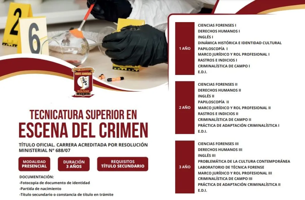 El nivel superior del Instituto Jesús Sacramentado (IJS) de Bolívar mantiene abierta la inscripción para cursar la Tecnicatura en Escena del Crimen, una innovadora carrera con rápida salida laboral que va por su segunda cohorte. En esta nota, detallamos cuáles son los requisitos para anotarse, el formato de cursada y los posibles lugares donde conseguir un puesto de trabajo luego de recibirse.