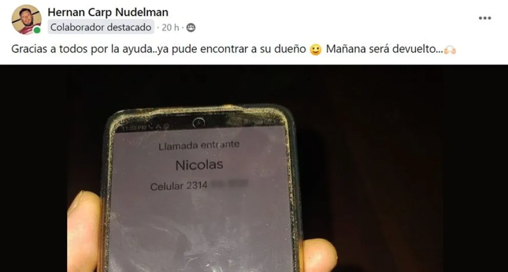 Luego de publicar en sus redes la foto del teléfono que había encontrado e intentaba devolver, algunas personas lo contactaron y le dijeron que era suyo, pero “al no ser la marca, no respondía más”. Al llegar a su casa recibió un mensaje en el que detallaron las características y supo que realmente era la dueña del dispositivo.