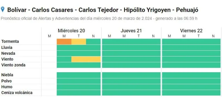Según informó el SMN, el alerta por tormentas en Bolívar, Carlos Casares, Pehuajó, Carlos Tejedor y Henderson que se anunció el martes se extiende hasta la tarde de este miércoles. No obstante, desde el mediodía comienza a regir un alerta por vientos, que podrían disipar las posibles tormentas y marcarían una fuerte baja de la temperatura.