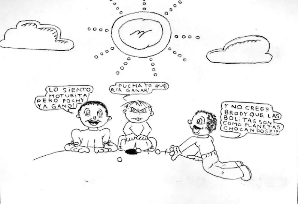 En la primer tira, 'Boty' hace referencia a dos amigos que tenía cuando era chico. 'Brody', que se mantiene hasta el día de hoy, y 'Moturita'. 'Pochy', por su parte, le gana a la bolita a ambos y mientras uno acepta la derrota, el otro no. Mientras, él queda maravillado en el choque de las bolitas.