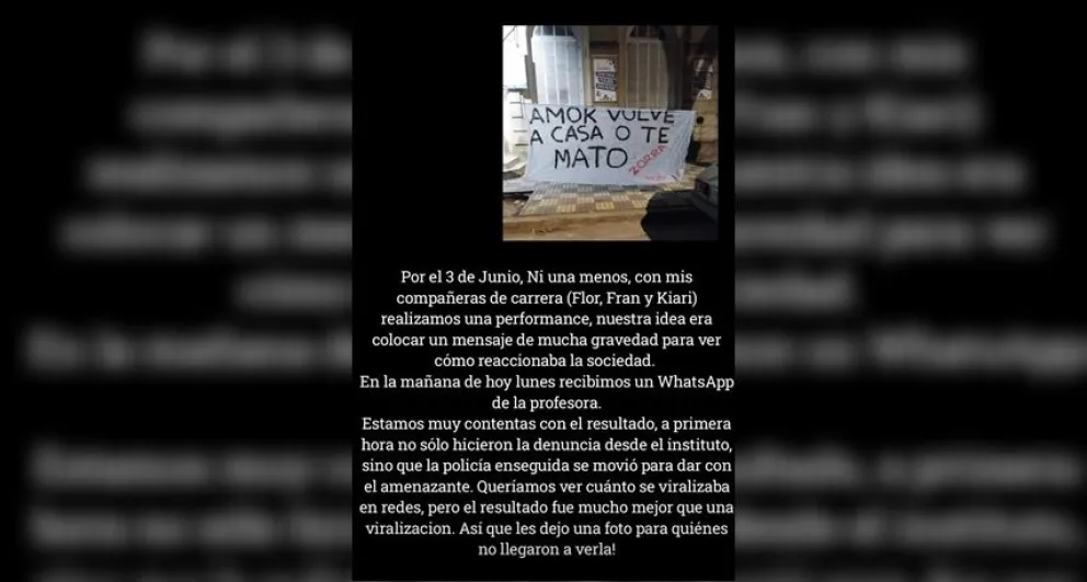 Sobre el final del día, una estudiante de la institución publicó en sus redes sociales una foto del pasacalle y explicó de qué se trató la iniciativa. “Por el 3 de junio, Ni Una Menos, con mis compañeras de carrera, realizamos una performance, nuestra idea era colocar un mensaje de mucha gravedad para ver cómo reaccionaba la sociedad”, comienza el posteo.