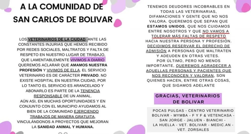 El texto dirigido a la comunidad de Bolívar cuenta con el apoyo de 13 veterinarias locales. “Los veterinarios de la ciudad, ante las constantes injurias que hemos recibido por redes sociales, maltratos y falta de respeto en nuestro lugar de trabajo, que lamentablemente vivimos a diario, queremos aclarar que amamos nuestra profesión y vivimos de ella”, comienza el comunicado.