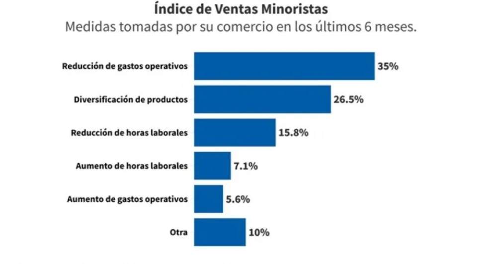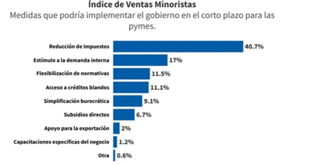 CAME elaboró el Índice de Ventas Minoristas Pymes con un relevamiento mensual entre 1.276 comercios minoristas del país. Entre las medidas que podría implementar el Gobierno para paliar la situación, se espera la reducción de impuestos, que representa el 40,7% de las respuestas, seguida por el estímulo a la demanda interna con un 17%.