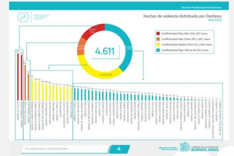 La información que arrojó el informe da cuenta que en los distintos distritos se dieron 4.611 hechos de violencia durante 2023. Con una conflictividad muy alta que representa más de 300 casos, se ubican en primer lugar la Unidad Nº9 de La Plata (385 casos) y la Unidad Nº1 de Lisandro Olmos (372).