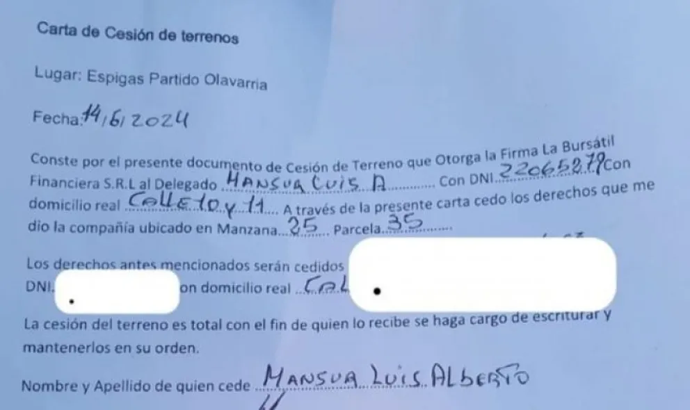 En el contacto periodístico el funcionario aclaró que sigue en su cargo "hasta que se presente alguien acá en la delegación. De acá no me voy a mover". En cuanto a los terrenos, detalló que se tratarían de la compañía "La Bursatíl SRL", ya que está "en contacto con el apoderado, Alberto Fortín. Esta persona me dio el permiso para cederlos y que cuando tuvieran las escrituras las firmaría la Escribanía Lucas, como otras veces".