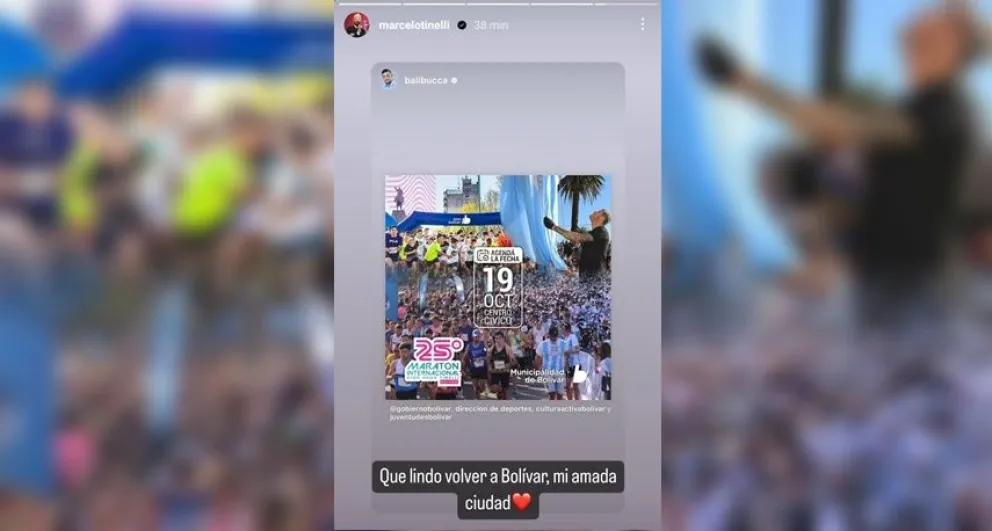 El senador provincial Eduardo 'Bali' Bucca publicó en su cuenta de Instagram la foto en la que se lo ve a Tineli izando la bandera en el mástil central de Bolívar y tiene la fecha de la próxima maratón. El reconocido conductor compartió el posteo con la inscripción “qué lindo volver a Bolívar, mi amada ciudad”.