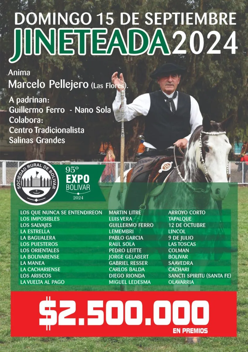 La Jineteada 2024, que estará apadrinada por Guillermo Ferro y ‘Nano’ Solá, y tendrá la animación a cargo de Marcelo Pellejero, se realizará el domingo 15 de septiembre. Reconocidas tropillas de la zona y el país se harán presentes en Bolívar.