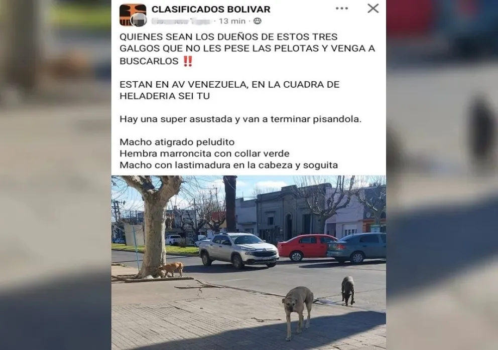 Este miércoles una vecina de Bolívar publicó en las redes sociales que tres perros galgos se encontraban a la deriva en una avenida céntrica de Bolívar y pidió a quienes sean sus responsables que los vayan a buscar. “¿O ya no les sirven y por eso los tiraron?”, se preguntó.