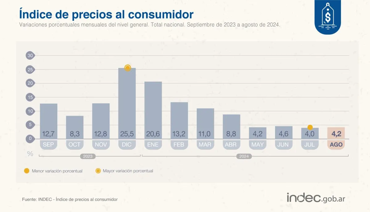 El Instituto Nacional de Estadística y Censos (INDEC) informó este miércoles que la inflación de agosto fue del 4,2% y acumula en el año un 95%. Las principales subas se dieron los sectores vinculados a vivienda, servicios públicos y combustibles.