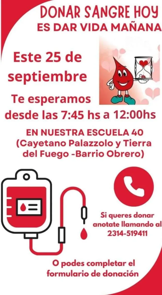 El próximo miércoles 25 de septiembre, de 7.45 a 12 horas y en la Escuela 40 ubicada en Cayetano Palazzolo y Tierra del Fuego, barrio Obrero, se realizará una colecta de sangre. La jornada se organiza bajo la premisa “Donar sangre hoy es dar vida mañana”.