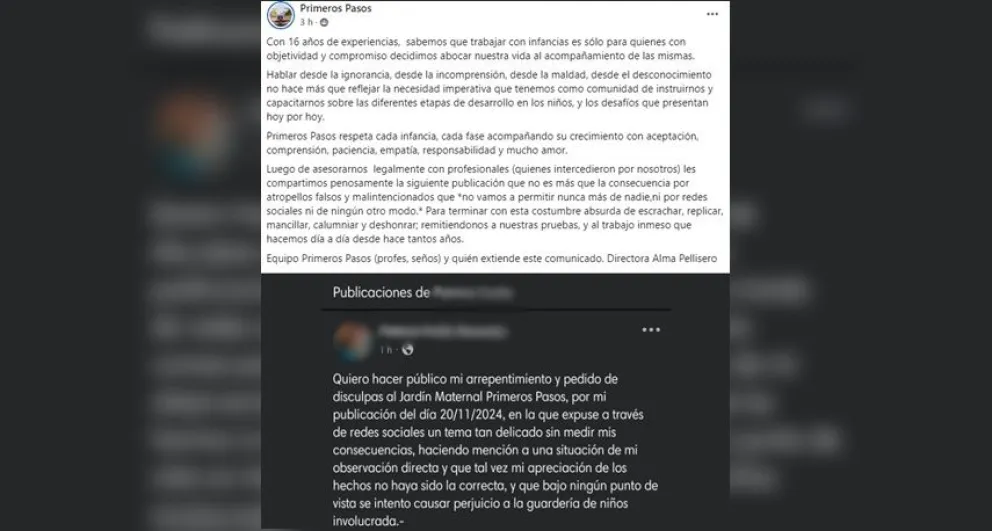 Posteriormente, la vecina realizó un posteo en Facebook para contar su versión de lo ocurrido y la directora del jardín contactó a su abogado para saber cómo actuar ante la acción que tuvo la mujer. “Hicimos una intimación para que se retracte, tuvo que hacer las disculpas porque yo presenté las cámaras y el abogado me dijo que íbamos a presentar una querella penal”, indicó Alma.