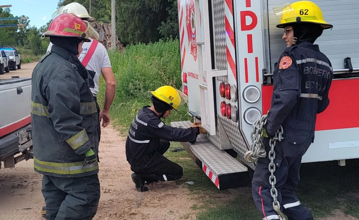 La dotación de bomberos, a cargo de Franco Rojas, asistió en uno de los móviles del cuartel con los elementos pertinentes para extraer el rodado del canal.