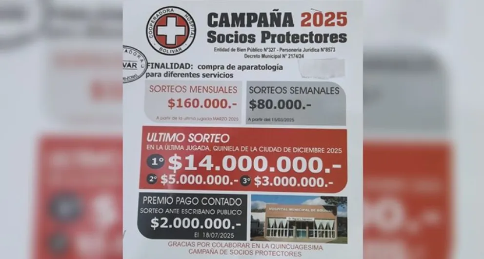 Integrantes de la comisión Cooperadora del Hospital Miguel Capredoni de Bolívar lanzaron la campaña Socios Protectores 2025 que comenzará a entregar premios a partir de marzo. El dinero recaudado, como cada año, será destinado a la compra de aparatología para diferentes servicios del nosocomio.