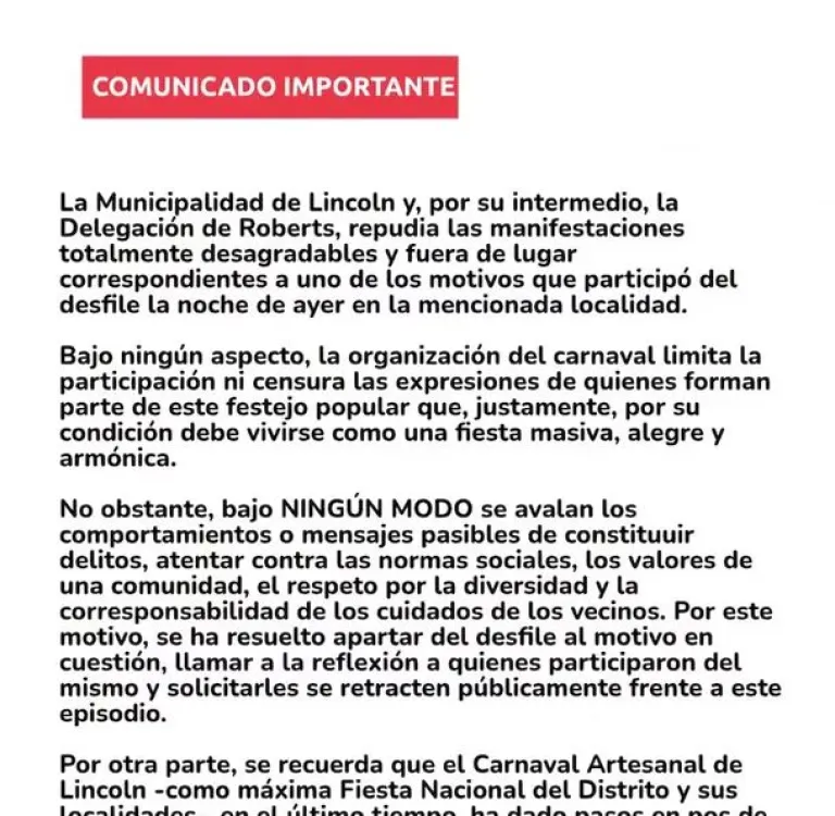 Ante el rechazo generalizado, la Municipalidad de Lincoln a través de la Delegación del Carnaval de Roberts, emitió un comunicado en el que rechazó las manifestaciones del grupo de jóvenes.