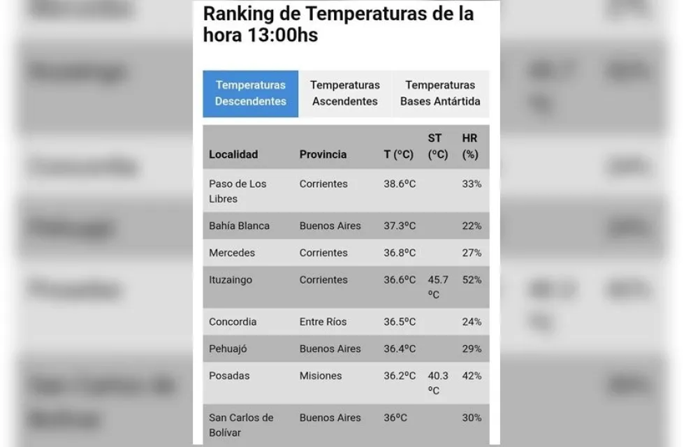 Según el reporte publicado por el Servicio Meteorológico Nacional, la localidad de Paso de los Libres en la provincia de Corrientes, fue la primera en el ranking de lugares con mayor temperatura en el país a las 13 horas, con 38.6º. La siguieron Bahía Blanca, provincia de Buenos Aires, con 37.3º y otras dos ciudades correntinas: Mercedes e Ituzaingo con 36.8º y 36.6º, respectivamente.