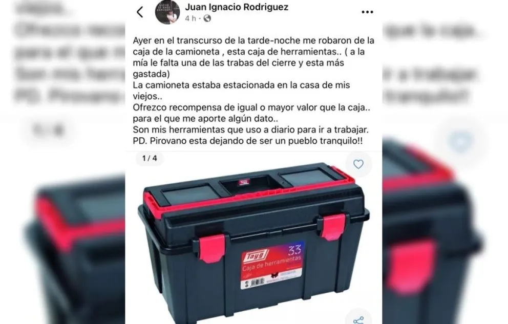 A través de sus redes sociales, un vecino de la localidad de Pirovano denunció públicamente el hurto de su caja de herramientas y ofreció recompensa a quien aporte datos para recuperarla. El hombre aseguró en el posteo que “está dejando de ser un pueblo tranquilo”.