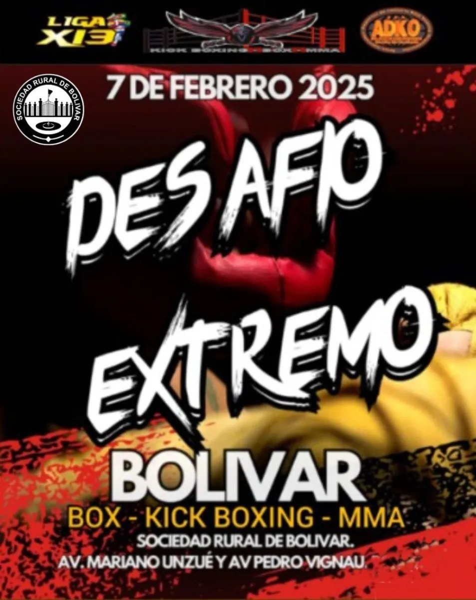 El viernes 7 de febrero, se realizará en las instalaciones de la Sociedad Rural de Bolívar el evento Desafío Extremo, un espectáculo que tendrá peleas amateur y semipro de Boxeo, Kick Boxing y MMA. Se encuentra habilitada la venta de entradas anticipadas y las VIP están por agotarse.