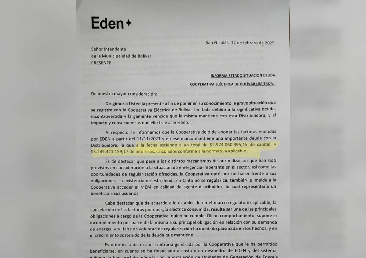En una reciente nota presentada ante la Municipalidad de Bolívar -Autoridad Concedente del servicio eléctrico-, con fecha 12 de febrero, el Gerente Comercial de EDEN S.A, Alejandro Biancosino, informó que la Cooperativa Eléctrica de Bolívar Limitada mantenía hasta ese momento una "significativa deuda, incontrovertida y largamente vencida", compuesta por $2.974.060.395,15 de capital y $5.249.421.159,17 de intereses "calculados conforme a la normativa aplicable".