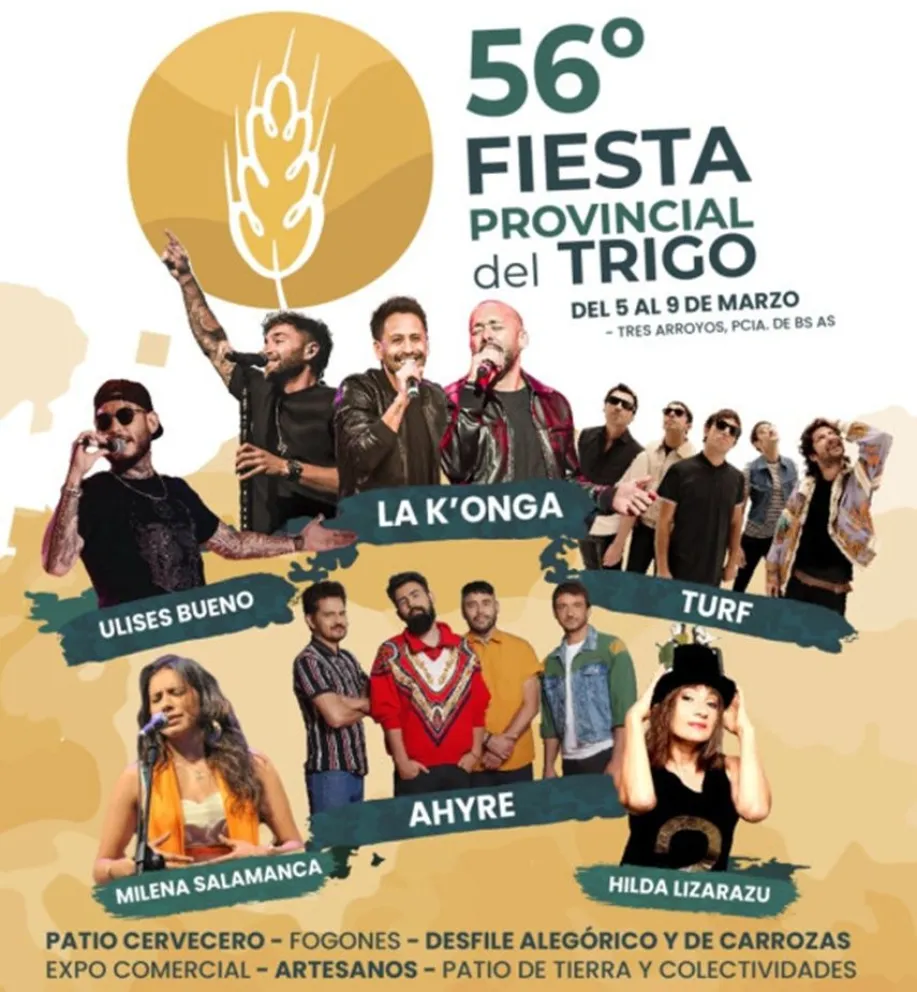 Hilda Lizarazu, Turf, Ahyre y Milena Salamanaca, Ulises Bueno y La K'onga son los espectáculos en vivo previstos para cada noche desde el 5 al 9 de marzo, respectivamente, en la 56º edición de la Fiesta del Trigo que tendrá lugar en el predio del Ferrocarril. Tres Arroyos tiene todo listo para recibir a los visitantes con una propuesta que combina la cultura, la música, la gastronomía y este año incorpora una cerveza propia que le pondrá el sello al encuentro.