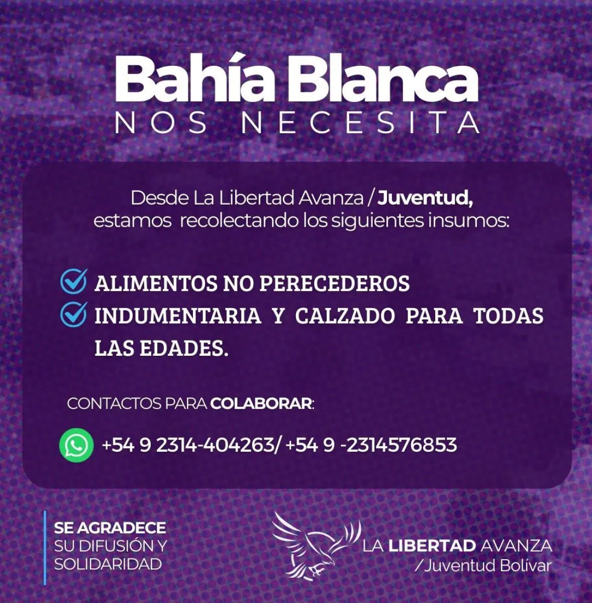 También, desde la Juventud local de La Libertad Avanza recolectan alimentos no perecederos, indumentaria y calzado para todas las edades. Los números de teléfono de contacto son: 2314 404263 y 2314 576853.