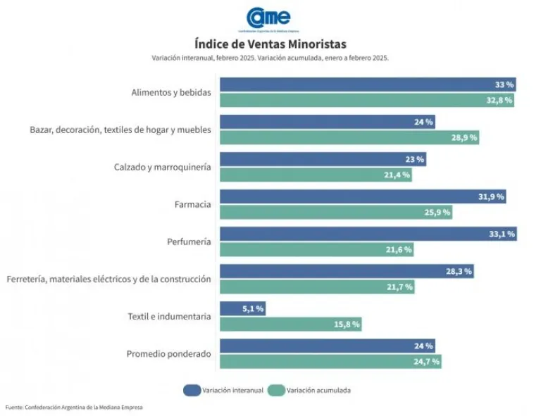 Según el Índice de Ventas Minoristas (IVM) de la Confederación Argentina de la Mediana Empresa (CAME), en febrero, los rubros con mayores incrementos interanuales fueron perfumería (+33,1%), alimentos y bebidas (+33%) y farmacia (+31,9%). A nivel acumulado en el bimestre, alimentos y bebidas lideran con un crecimiento de 32,8%, lo que refleja una alta demanda por productos básicos.