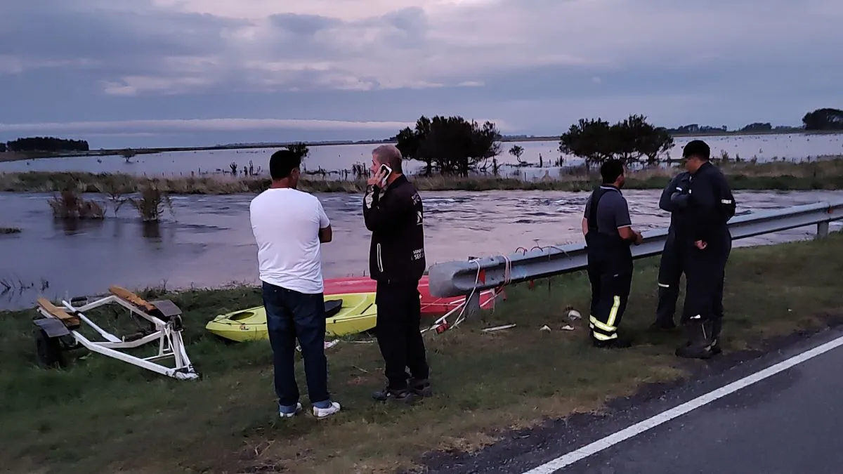 Desde que se conoció la noticia de la colisión entre dos camionetas en el kilómetro 270 de la Ruta 205, Bomberos Voluntarios especialistas en rescate acuático comenzaron la búsqueda de las dos hombres que cayeron al canal Piñeyro en el vehículo. El tercer ocupante que viajaba en el rodado logró salir.