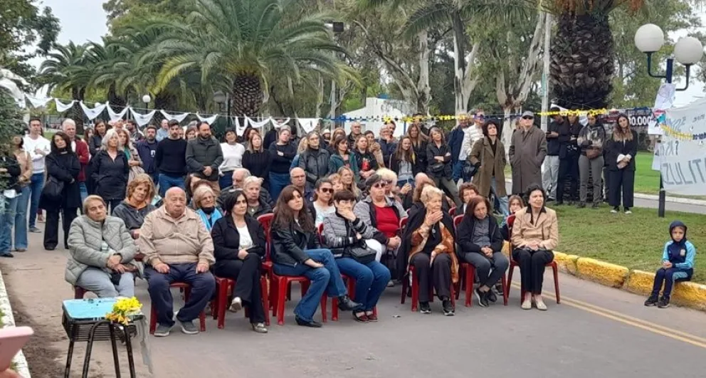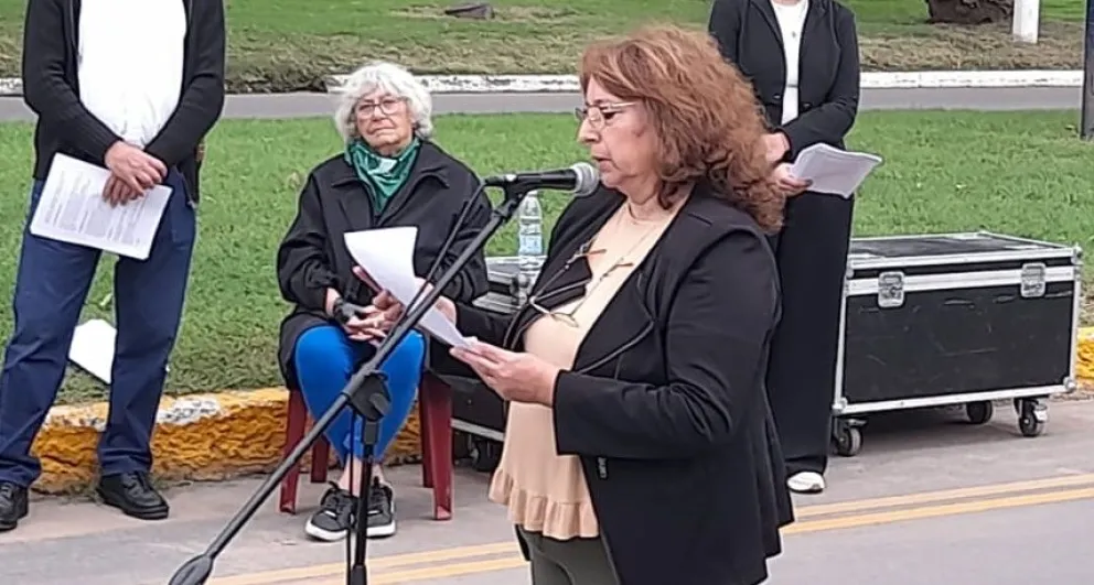 También Eladia Álvarez, Agustina Fressa, Guadalupe Gerea, Mónica González, Celia González y Marisol Darretche, representantes del colectivo Tierra Viva, realizaron una intervención que tuvo como eje conectar los 'vuelos de la muerte' que se realizaban durante la última dictadura cívica, eclesiástica y militar con los actuales vuelos con agoquímicos. Seguidamente, familiares de las y los desaparecidos bolivarenses colocaron ofrendas florales al pie del monolito construido en su memoria.