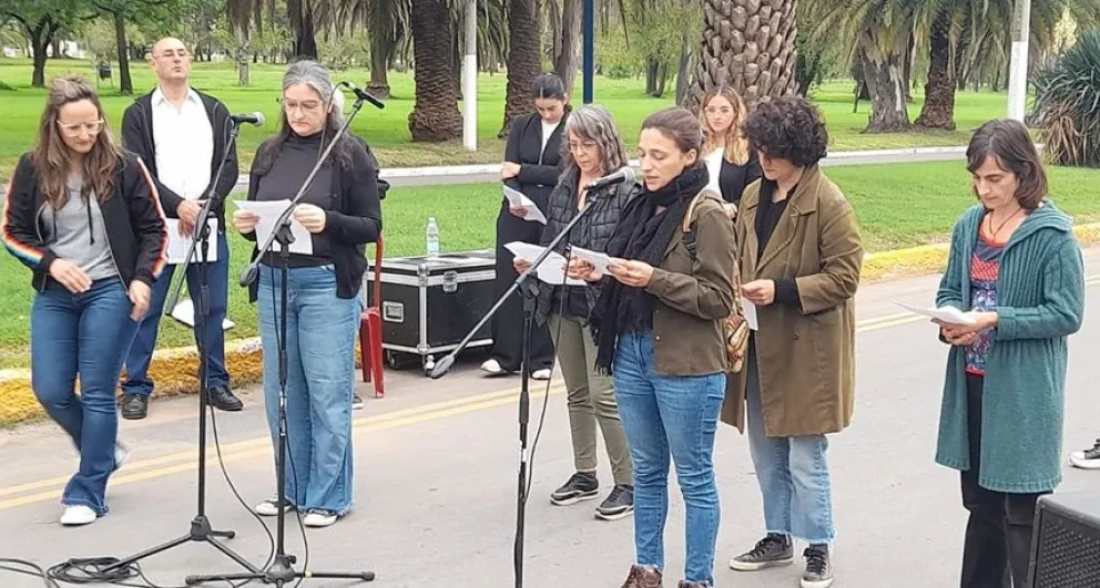 El acto se centró en la afirmación de la Memoria, Verdad y Justicia desde la recuperación de la democracia. “Una democracia muy debilitada en estos tiempos”, marcó Graciela Sagardoy, una de las conductoras del acto junto a Jorge Bergallo. “Hoy, sentimos que nos quieren borrar el pasado, sufriendo cruelmente el presente, para dejarnos sin un futuro humano. La deshumanización avanza a pasos agigantados mientras las libertades y derechos individuales y civiles retroceden”, afirmaron.