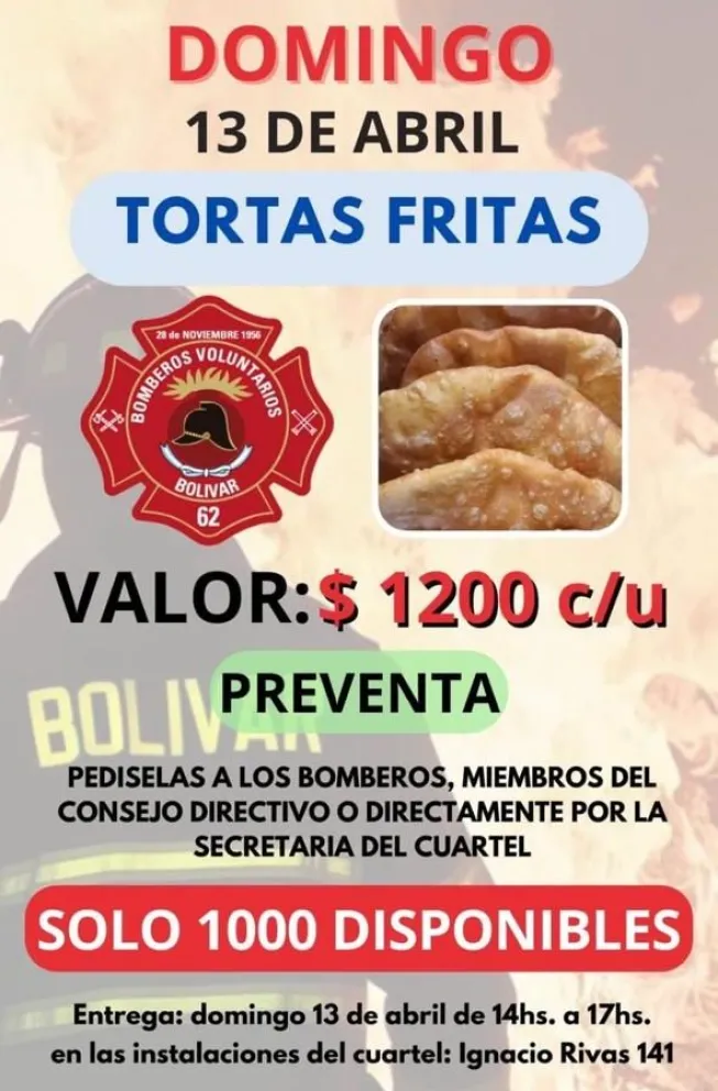 A través de sus canales oficiales y sus integrantes, Bomberos Voluntarios de Bolívar anunció la fecha de la primera jornada de tortas fritas del año y lanzó la preventa para el público. Solo habrá disponibles 1.000 unidades.