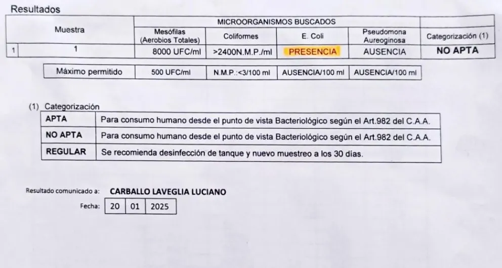 Este lunes, en contacto con los medios locales, mostró los resultados de análisis bacteriológicos de agua de la planta y mencionó que encontraron Escherichia coli. “Entra materia fecal, la planta está para procesar todo eso, que salga con niveles menores. Nunca va a salir apta para tomar y están contaminando no solo a la población sino todo el canal A y los campos, hace dos años”, dijo el concejal en la conferencia que transmitió Radio Federal Bolívar.