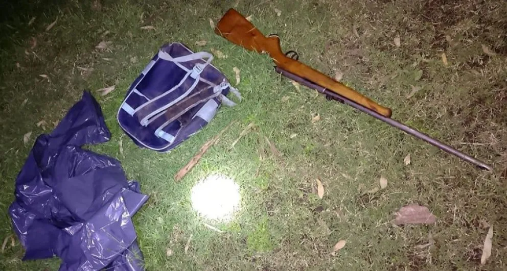 Dado que en la zona no había luz, se solicitó apoyo a otros móviles y se identificó que sobre un corral había un animal porcino de más de 140 kilos faenado recientemente. También, hallaron una carabina calibre 22, bolsas de consorcio y demás elementos que fueron secuestrados.