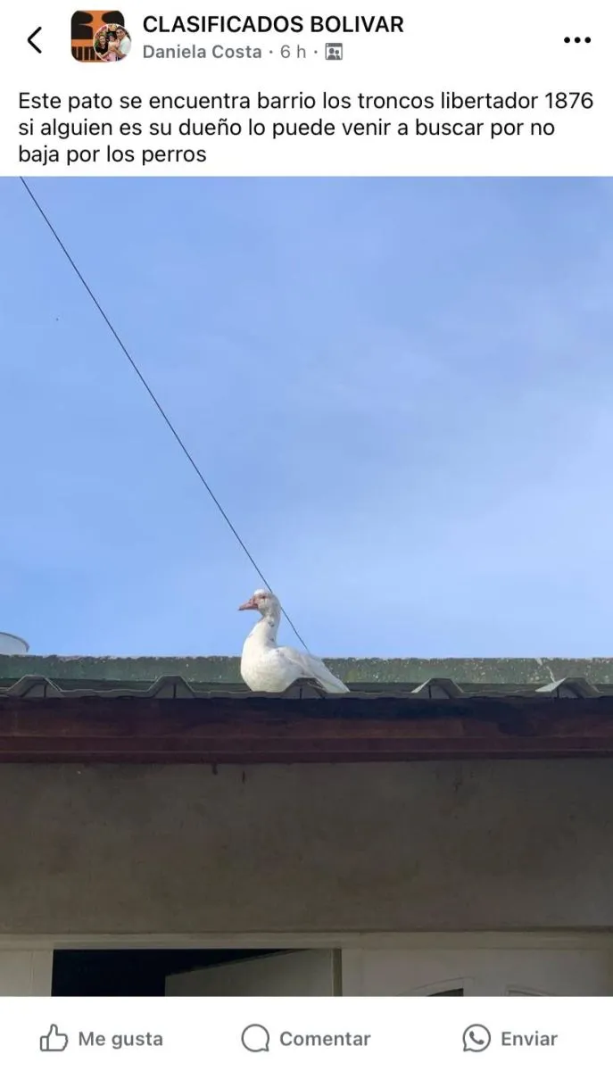 La mujer compartió la búsqueda en el grupo Clasificados Bolívar, detallando que el pato "se encuentra en barrio Los Troncos" sobre calle Libertador al 1800. En la publicación solicitó que "si alguien es su dueño lo puede venir a buscar".