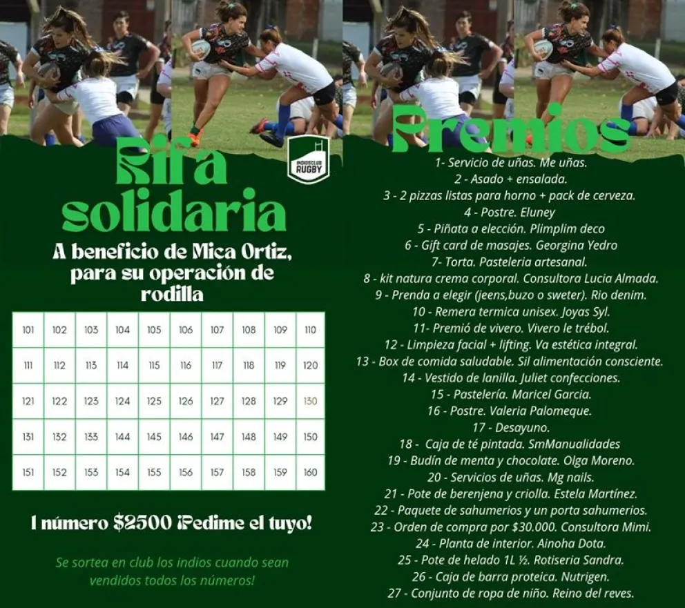 Quienes se interesen en colaborar con la operación de la deportista, pueden comunicarse a 2314-618693 o a través de las redes sociales de Indias Rugby Club. El sorteo se realizará en la sede del club (Pedro Vignau 601), una vez que los números sean vendidos en su totalidad.