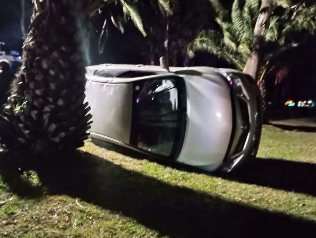 Por causas que tratan de establecerse, el auto, un Toyota Corolla, terminó volcado en un camino interno del parque a centímetros de una palmera. Afortunadamente no hubo que lamentar personas heridas y se supo que las mismas salieron por sus propios medios del habitáculo.
