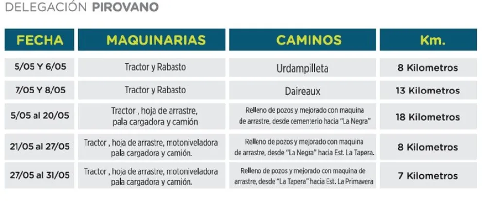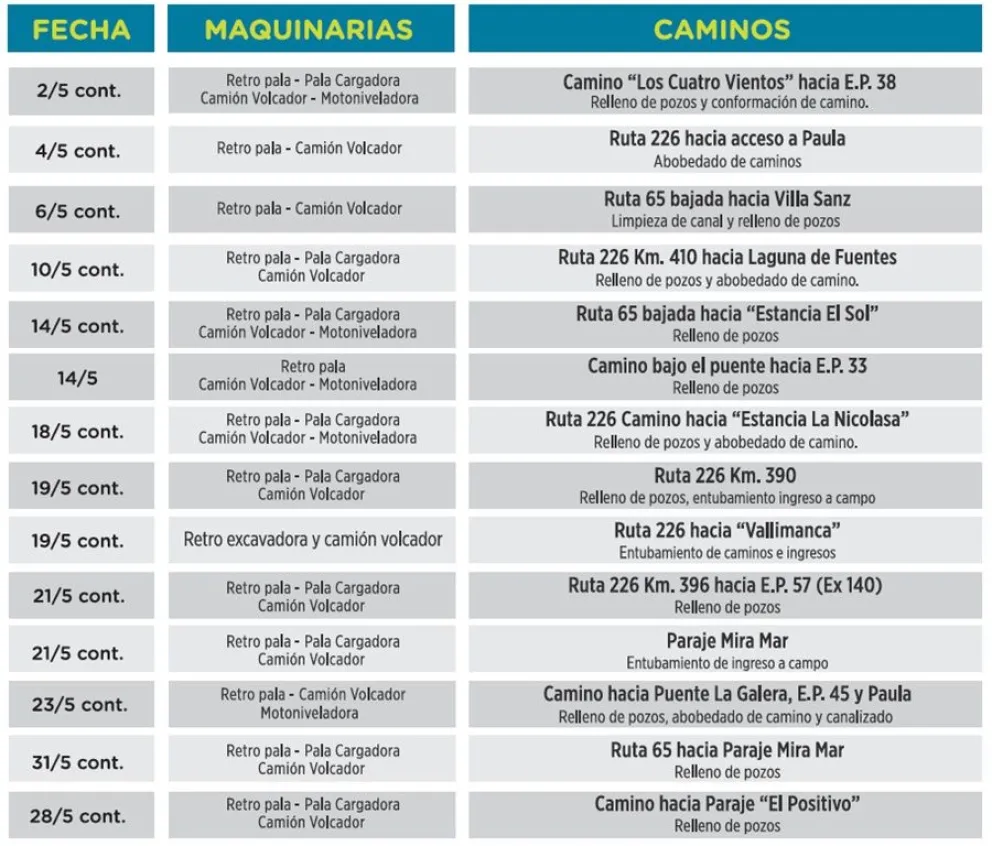 Por su parte, desde la Dirección de Vial municipal, enviaron a los medios un documento que detalla los trabajos realizados durante mayo, que incluye imágenes de las maquinarias utilizadas.