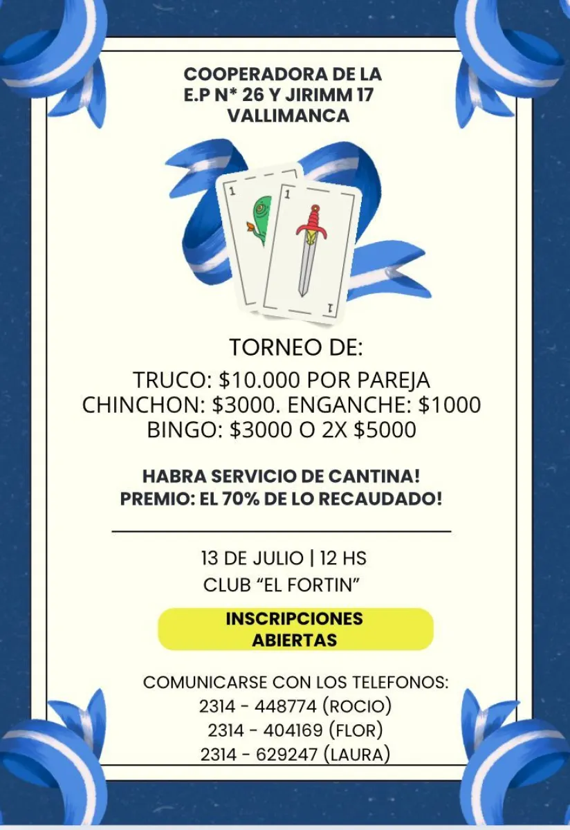 Las inscripciones para participar se encuentran abiertas para los y las interesados. Como premios para los ganadores se destinará el 70% de lo recaudado. Para ser parte, las personas pueden comunicarse a los teléfonos: 2314448774 (Rocío), 2314404169 (Florencia) o 2314629247 (Laura). La convocatoria es abierta a toda la comunidad bolivarense.