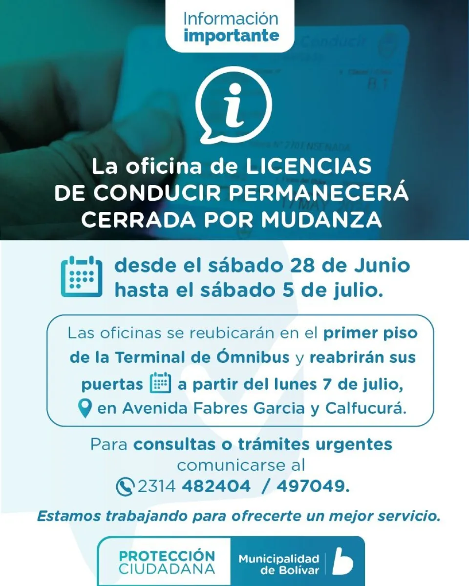 Según se comunicó oficialmente, sujetó a una mudanza programada para el mejoramiento del servicio, las dependencias para gestionar las licencias de conducir permanecen cerradas y sin funcionamiento a partir del sábado 28 de junio hasta el próximo sábado 5 de julio.