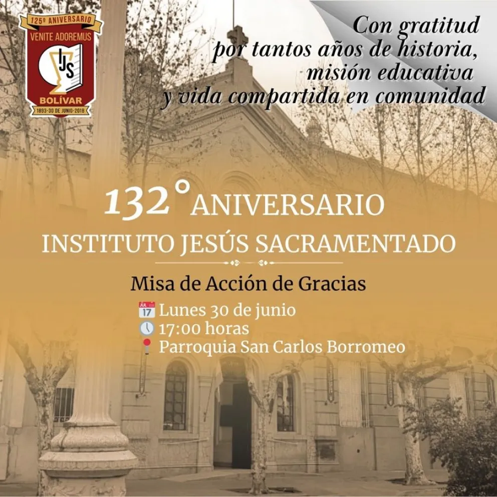 El próximo lunes 30 de junio a las 17 horas en la parroquia San Carlos Borromeo, tendrá lugar una misa de acción de gracias organizada por el Instituto Jesús Sacramentado en el marco de la celebración de su 132º aniversario.
