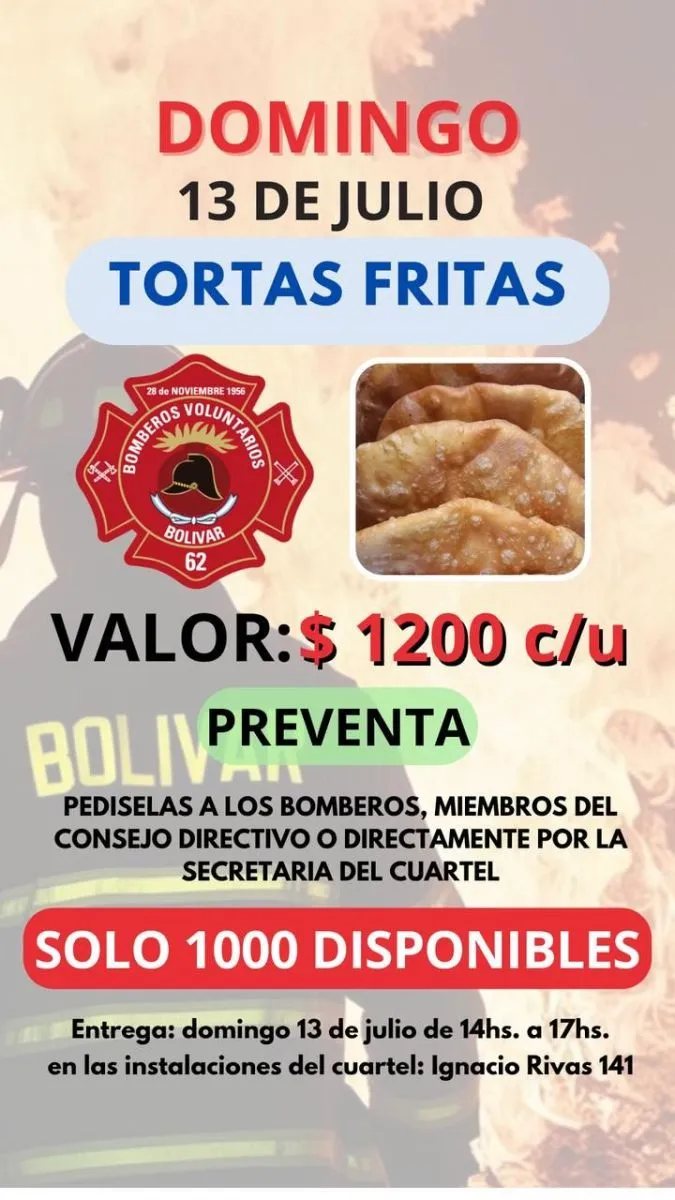 El valor de preventa que se mantendrá hasta el viernes 11 es de $1.200 por unidad, se harán 1.000 tortas fritas, y se pueden solicitar a través de los bomberos, miembros del consejo directivo o en la secretaría del cuartel ubicado en la calle Ignacio Rivas 141.