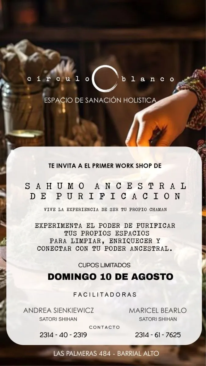 El espacio holístico Círculo Blanco ubicado en Las Palmeras 484, barrio Alto, Bolívar, organiza para el próximo domingo 10 de agosto el primer taller de sahúmo ancestral de purificación y protección. El encuentro será con cupos limitados, entérate cómo reservar un lugar.