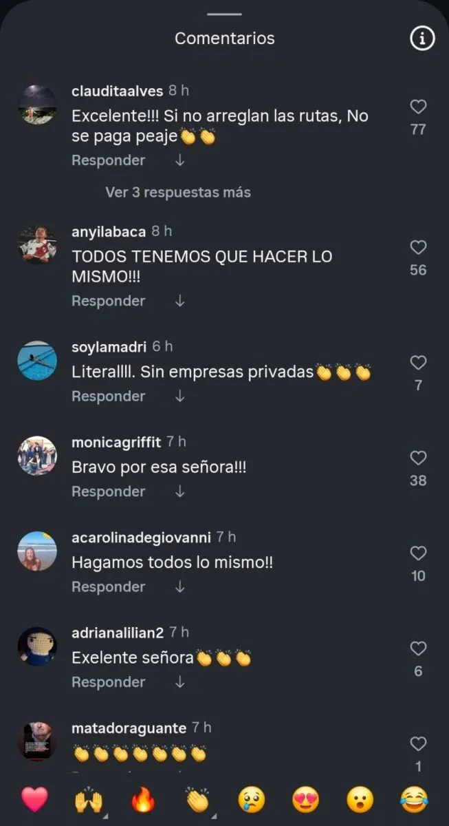 La mujer publicó el video y la repercusión fue inmediata. La mayoría de los comentarios coinciden en que, si más personas actuaran como ella, las concesionarias y empresas a cargo del mantenimiento se verían obligadas a cumplir.