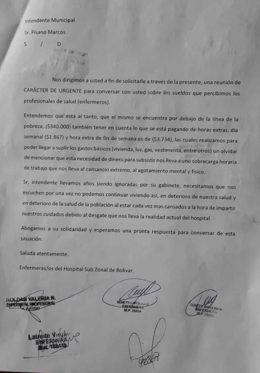 “Entendemos que está al tanto, que el mismo se encuentra por debajo de la línea de la pobreza, ($340.000) también tener en cuenta lo que se está pagando de horas extras, día semanal ($1.867) y la hora extra de fin de semana es de $3.734, las cuales realizamos para poder suplir los gastos básicos”, es parte de la carta dirigida al intendente que este viernes enfermeras de todos los servicios del hospital de Bolívar entregarán en mesa de entrada de la Municipalidad.