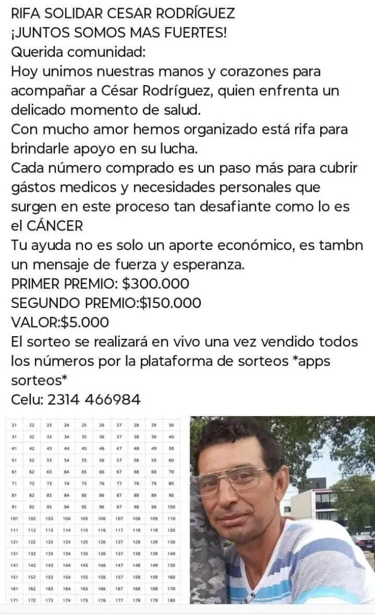 Cesar Rodríguez es vecino de la comunidad bolivarense y actualmente se encuentra atravesando un delicado momento de salud, por ello, sus allegados lanzaron rifa solidaria. Bajo el lema ‘Juntos somos más fuertes’ se busca cubrir los gastos que implica el tratamiento oncológico que el hombre se encuentra transitando.