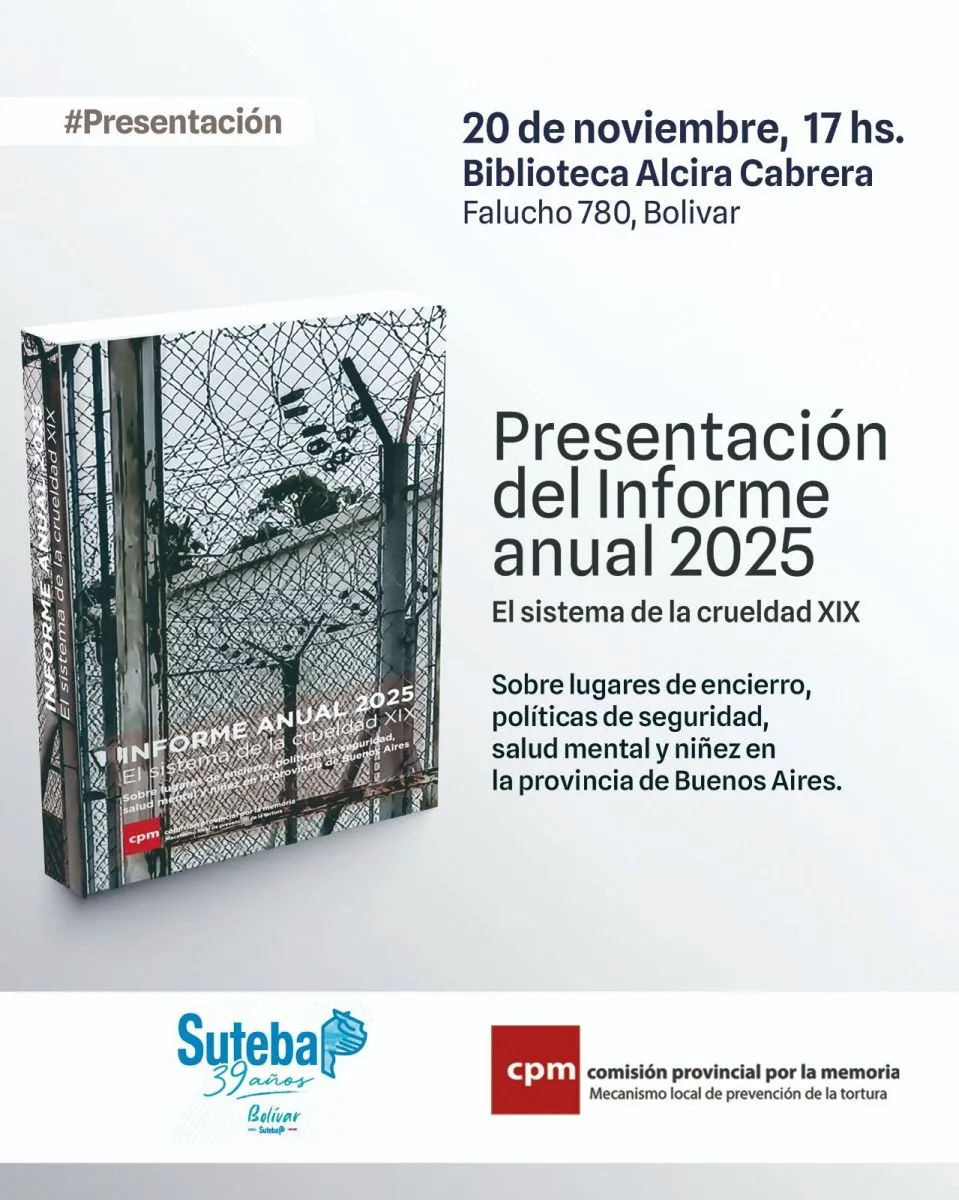 El próximo jueves 20 de noviembre desde las 17 horas, tendrá lugar en Bolívar, precisamente en la biblioteca Alcira Cabrera, la presentación del informe anual 2025 de la Comisión Provincial por la Memoria (CPM). El trabajo lleva por nombre ‘El sistema de la crueldad’ y trata sobre lugares de encierro, políticas de seguridad, salud mental y niñez en la provincia de Buenos Aires.