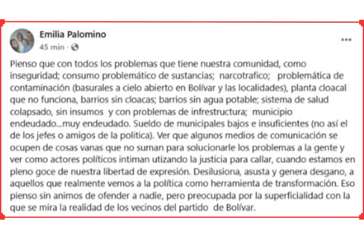 Para la concejal, esos medios que evitó nombrar abordaron el tema -que involucra a una persona políticamente expuesta, como es Pacho, y por lo tanto despierta el interés público- desde la "superficialidad" y se mostró preocupada por cómo miran "la realidad de Bolívar". Pero basta con googlear y utilizar los buscadores de los medios locales para encontrar allí vasta información sobre las preocupaciones que Palomino enumeró en su publicación.